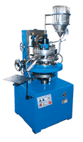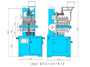 9 working positions are evenly distributed in three coaxial disks in the order of upper, middle and lower. Each position has a set of upper punch, die, lower punch and die pin. While with disks rotating, the upper and the lower punch would be up and down according to the curved guider. The pressing would be done when the punches through the pressing rollers.